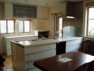 LDKの壁を取り壊しアイランド型システムキッチンに変更。あわせて建具、フローリングを交換しました。 システムキッチンは"ナスラック"の最上位機種ディプロア。オールステンレスとカウンターライトがワンランク上を物語っています。まさに究極のキッチン。